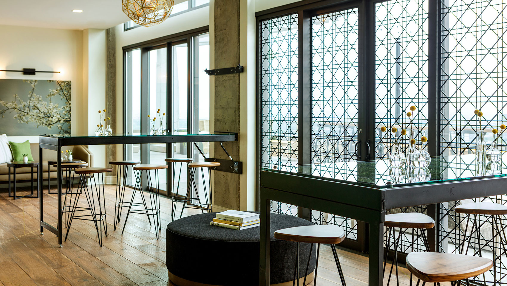 - Sophisticated atmosphere featuring luxury furniture, hardwood floors, natural light, and floor-to-ceiling windows